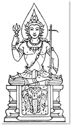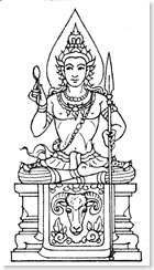 Complexion : dark green. Vehicle : an elephant. Cloth : red. In his right hand, a thunderbolt, and in the left one, a hook.