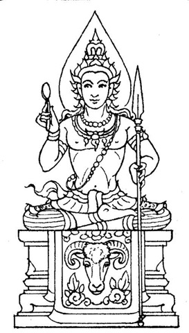 Complexion : red. Vehicle : a ram. Cloth : red. A spoon in his right hand and a javelin in his left hand.