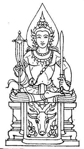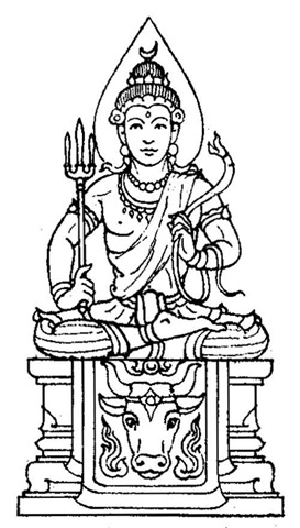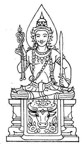 Complexion : White. Vehicle : a Cow. Cloth : White. A trident in his right hand and a chain of mythical serpents in his left hand.