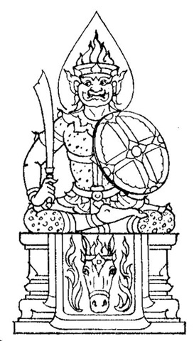 Complexion : Dark blue. Vehicle : a Horse. Cloth : Yellow. A sword in his right hand and a shield in his left hand.