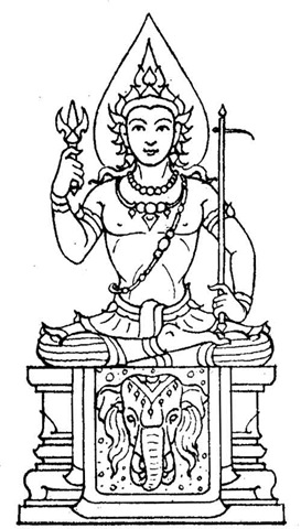 Complexion : dark green. Vehicle : an elephant. Cloth : red. In his right hand, a thunderbolt, and in the left one, a hook.