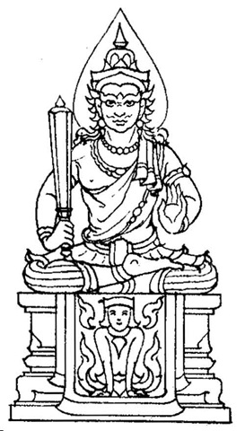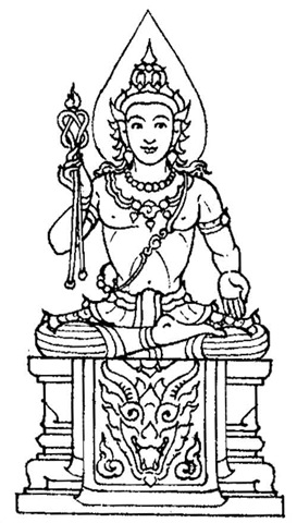 Complexion : White. Vehicle : a Fabulous marine dragon. Cloth : Yellow. A noose in his right hand while his left hand in the gesture of giving a boon.